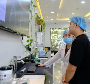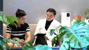 Bác sĩ CK.II Phạm Kim Thành tư vấn cho một du khách đến Đồng Tháp du lịch và khám nha tại Nha khoa Phương Thành