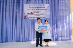 Bà Võ Thị Phương Ngọc – Trưởng Phòng Tham mưu, Nha khoa Phương Thành trao tặng bảng tượng trưng các suất quà và gói khám răng miệng cho Hiệu trưởng nhà trường
